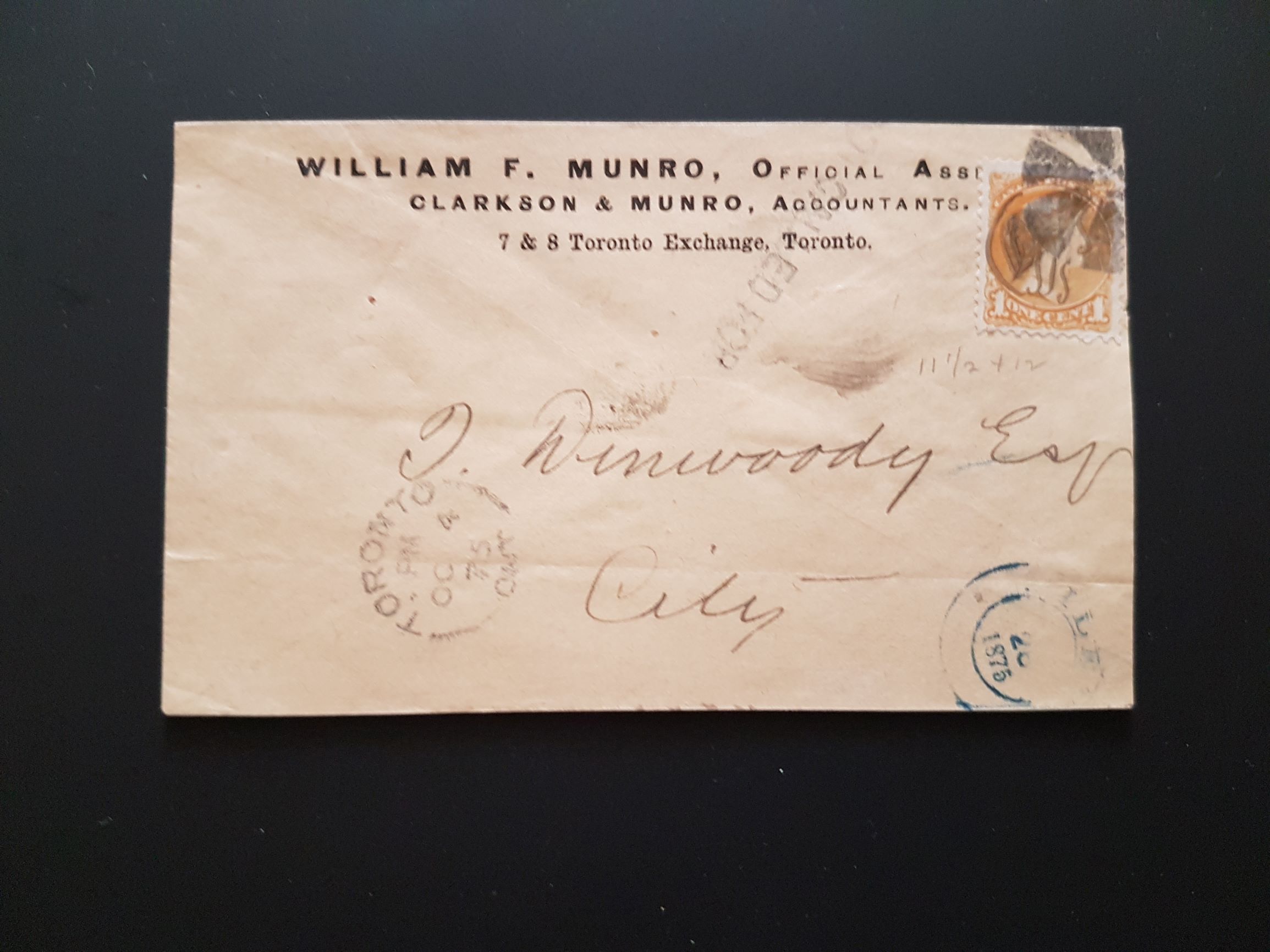25Envelope addressed to J. Dinwoody from Clarkson and Munro, 1875.