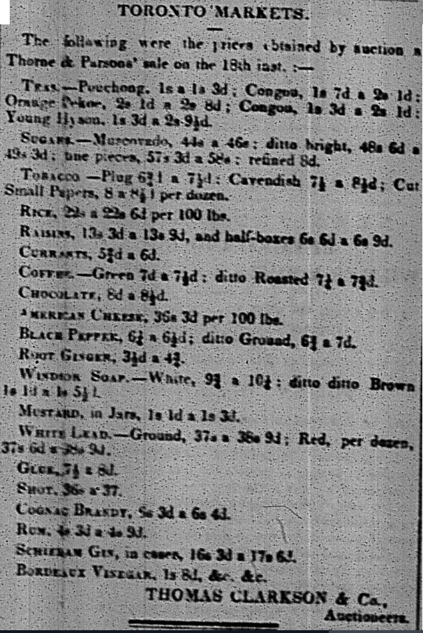 Smiths & Clarkson appears to have been active in a number of businesses, including as merchants for finished goods, such as whiskey, and raw materials, such as glass. They also acted as agents for a number of other businesses. These activities are a preview of the roles Thomas would take on in Toronto.