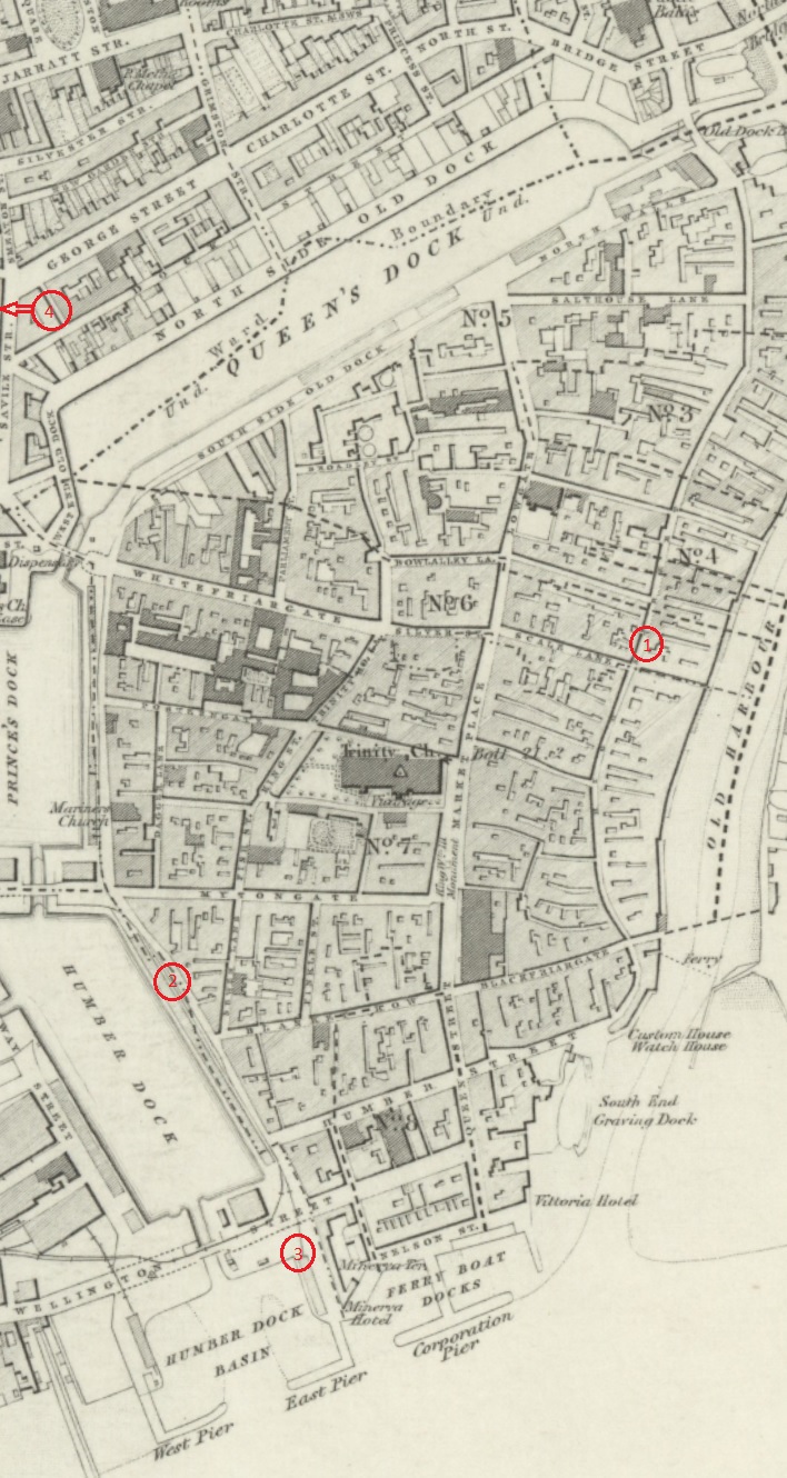 Also from the 1826 directory, Thomas himself lived on the Humber bank,61 somewhere near the river south of the old town (number 3). This area may have been less developed in the 1820s than it was in this 1853 map. By 1827, the birth record of the third child describes Thomas as living in Myton,62 which was the community immediately to the west of the three basins, just off the left side of the map fragment (number 4).