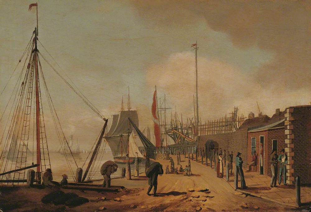 The name of Kingston-upon-Hull is frequently shortened to "Hull", as it was in Thomas's day. Hull was then a major port near the east coast of England where the Hull River meets the Humber River. The Humber is quite wide near Hull, so ocean-going vessels had no trouble navigating up the river to dock at one of Hull's many docks. The Humber bank in Hull is pictured at right in 1829.29