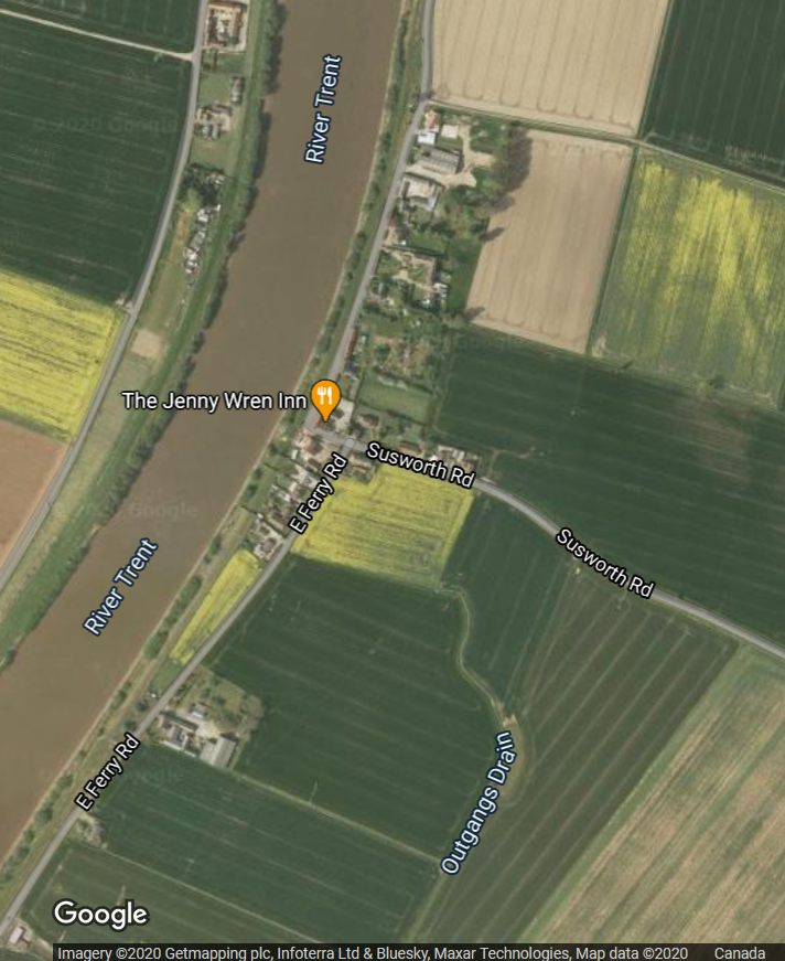 Today, Susworth has fewer than thirty buildings in total, as can be seen in the satellite image at right,8 and it is doubtful that it ever was much larger. Susworth resembles other settlements north of Gainsborough, Lincolnshire, its layout reflecting dependence on the river and the river's function as a major transportation route used for commerce, with a single street running parallel to the river, and a rural highway intersecting at in a "T" junction.9 Gainsborough is a town close to Susworth, upstream along the River Trent.