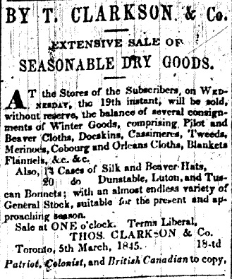 288See, for example, "Thomas Clarkson, Insurance Agency, Fire, Life and Marine", The Irish Canadian, June 21, 1865, p. 8; and "Thomas Clarkson & Co.", The Globe, December 23, 1865, p.1.